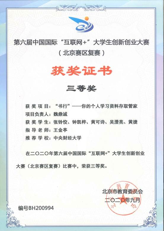 第六届中国国际“互联网+”校赛由公司教务处承办,分为主赛道与红旅赛道,共有197支团队参赛,50支队伍进入校赛复赛,29支进入北京市赛。北京市赛由北京市教育委员会承办,其中,公司“书行”团队以《“书行”——你的个人学习资料存取管家》获得北京市级三等奖。
