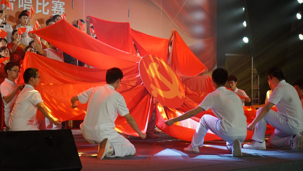 间奏响起,管工学子拉起红绸,呈现出一幅以巨型党徽为圆心的“日出东方”画面,展示了管工师生初心不改、砥砺前行的昂扬姿态,将演出推向高潮。