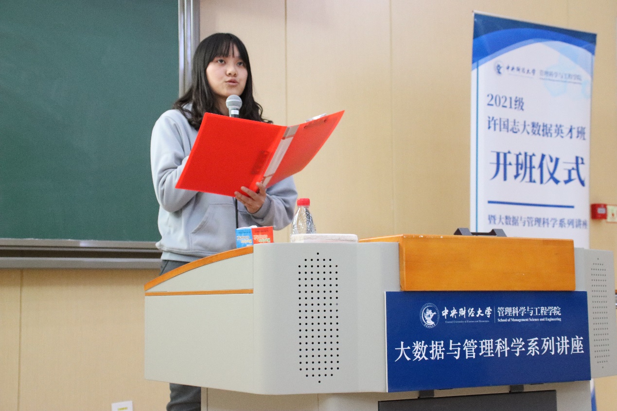 2020级英才班员工、国家奖学金获得者张君玉作为在校生代表发言。她结合自己大学一年以来的学习经验,向新生分享了三点建议。一要做到志存高远,对专业有深度的认知。她表示,复合型背景在未来具有核心竞争力,同学们要同时提高自己的数据分析能力与商业洞察力。二要脚踏实地,打好基础。数学、计算机、经济与金融作为英才班的三个培养方面,分别对应的是员工的数学思维、编程技能与商业洞察力,因此,基础学科的学习非常重要。三要专注课堂,享受课堂,注重与老师交流的机会。英才班享有顶尖的团队团队与充足的教育资源,大家应充分珍惜学习机会,抓住机遇。张君玉鼓励学弟学妹们不断探索,拓展视野,希望同大家共同进步,一起努力成长为大数据管理与应用领域的优秀人才。