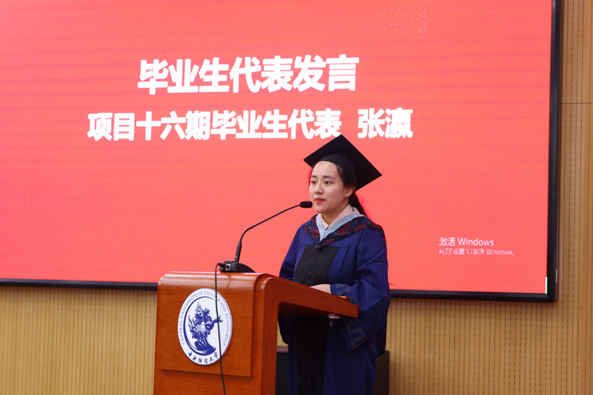 在毕业生代表发言环节,项目十六期春季班张瀛同学深情回忆了学习过程中的蜕变与成长、奋斗与收获,并向全体毕业生倡议,不辜负母校与恩师培养和教诲,在今后的学习工作中,争做“大勇者”,“卒然临之而不惊,无故加之而不怒”。