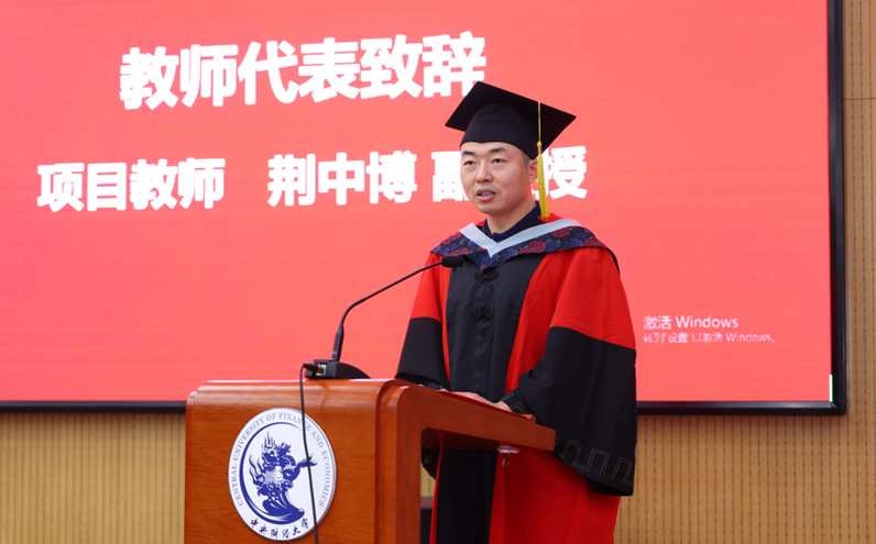 中财史蒂文斯项目中方负责人、副经理荆中博老师作为教师代表致辞。荆中博老师祝贺同学们经过努力和付出,终于收获了丰硕的成果。他期望同学们在今后的工作生活中能运用所学,不断提升个人能力,积极应对各种挑战。