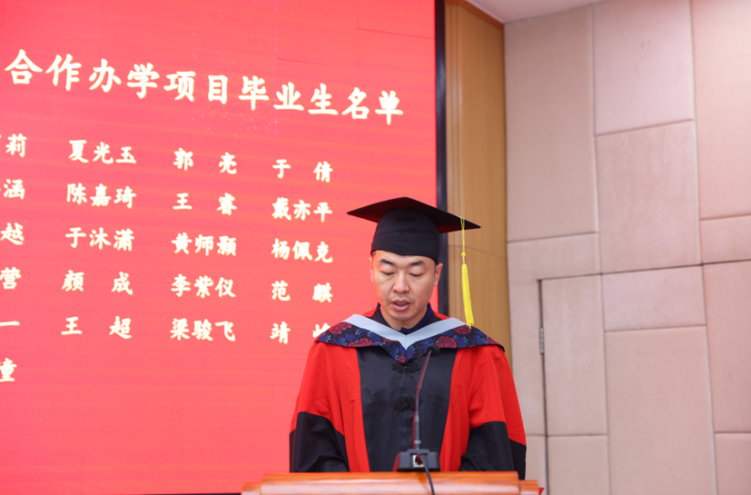 首先由荆中博副经理宣读《关于中财史蒂文斯项目2023年学员毕业及授予硕士学位的决定》。经suncitygroup太阳成集团和美国史蒂文斯理工公司审核,今年中财史蒂文斯项目共有39名学员毕业并取得硕士学位。