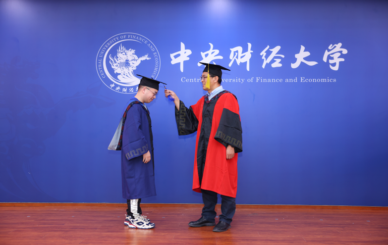 中财史蒂文斯项目中方负责人、副经理荆中博老师主持学位授予仪式,毕业生们逐一上台,刘志东经理为同学们颁发美方学位证书和中财结业证书,拨穗正冠。