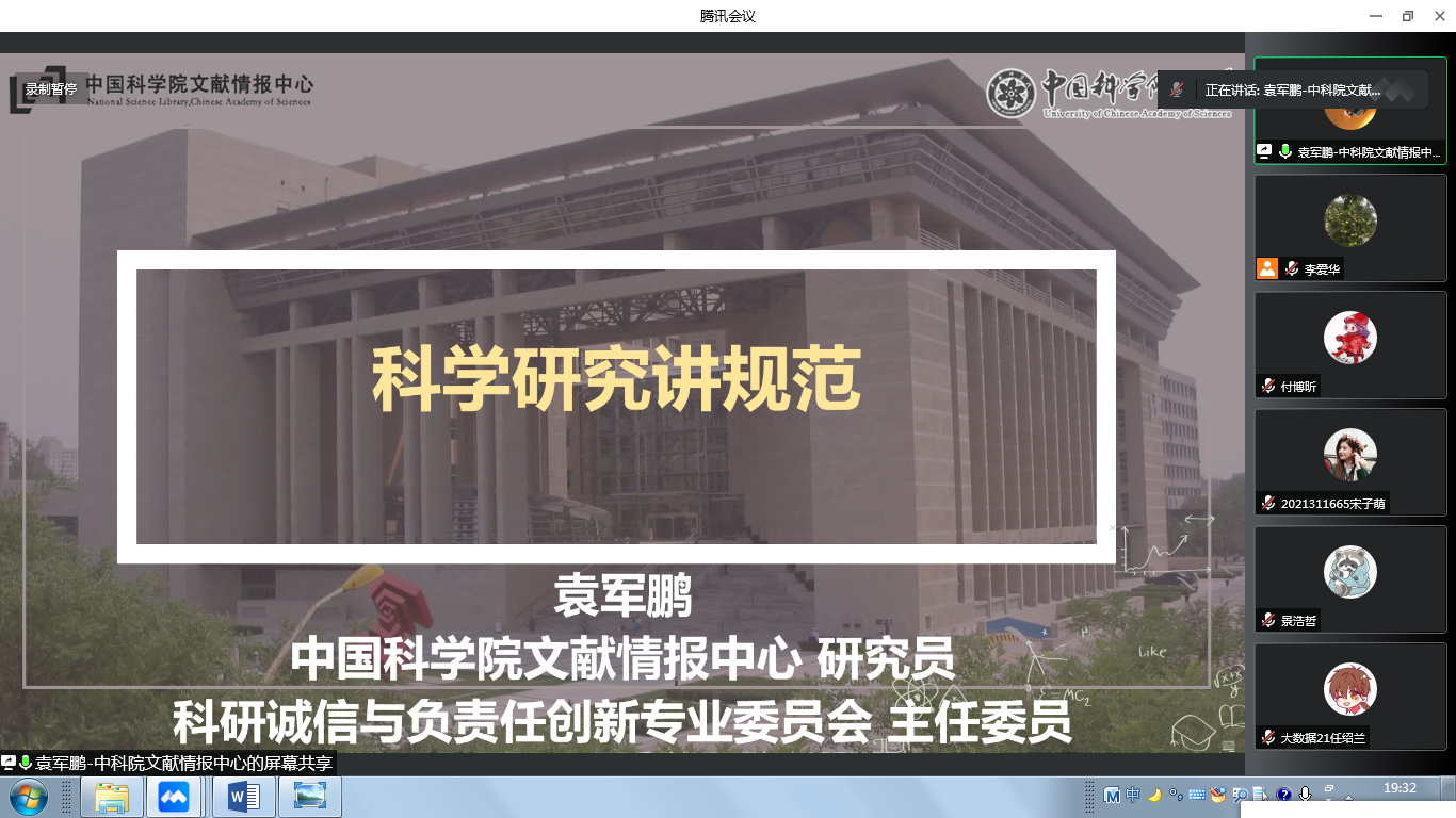 2022年7月15日晚19:30,中国科公司情报文献中心研究员、中国科公司大学岗位教授、博士生导师袁军鹏受邀来为2021级“许国志大数据英才班”同学做关于科学研究规范的讲座。