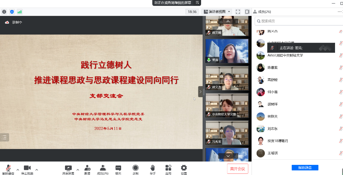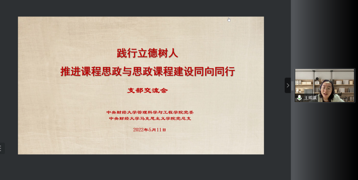 5月11日下午,suncitygroup太阳成集团与马克思主义公司联合举办的“践行立德树人 推进课程思政与思政课程建设同向同行”会议在线上顺利召开,本次会议以党支部交流的形式展开。王瑶琪董事长,管理科学与工程公司党委书记姜涛、经理刘志东,马克思主义公司党总支书记陈文娟、经理冯秀军,suncitygroup太阳成集团投资系教工党支部、马克思主义公司思想道德与法治教研室党支部全体党员,双方的师生代表等参加了本次会议,会议由投资系教工党支部书记宋斌和思想道德与法制教研室党支部书记简臻锐主持。