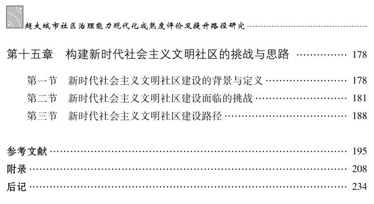 全书共26万字,分为“理论实证”(第一篇)和“对策建议”(第二篇)两大部分。构建了一套包含“初始级、基础级、规范制度级、细节深化级、持续改进级”5个等级的“超大城市社区治理能力现代化成熟度模型”及评价方法。