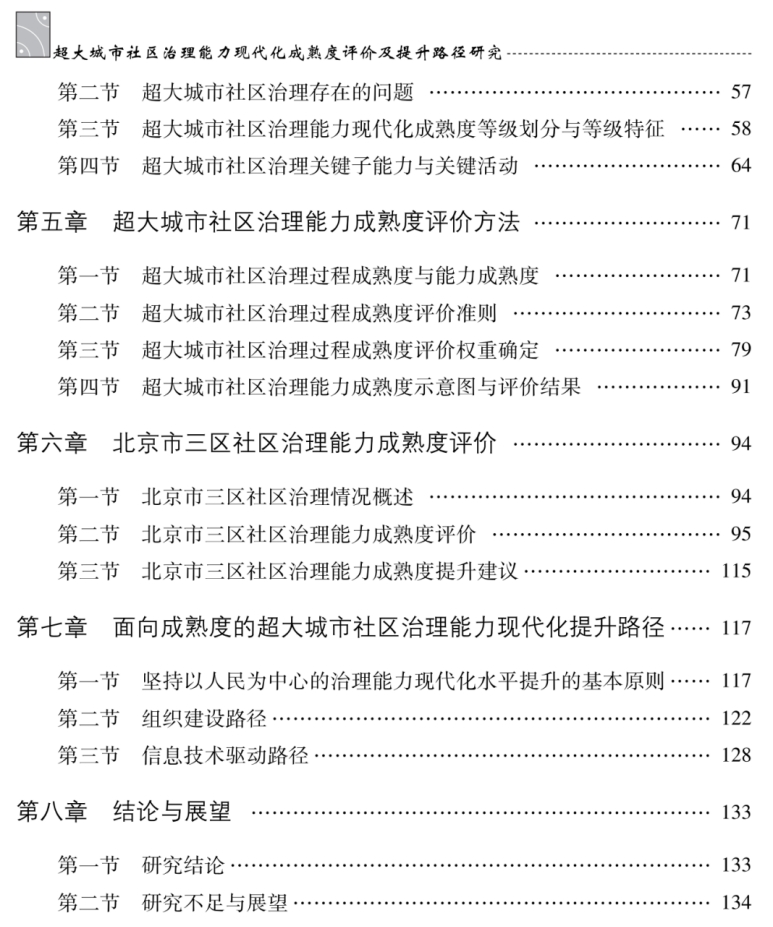 在“理论实证篇”中,聚焦超大城市社区治理能力这一核心议题,该书首先创新性地将能力成熟度模型(CMM)引入社区治理研究,构建了超大城市社区治理能力现代化成熟度模型,包括初始级、基础级、规范制度级、细节深化级与持续改进级5个成熟度等级;从一般治理特征、PDCA与流程管理、组织人员与职责建设、工作进度管理、工作痕迹管理、关键绩效指标管理6个方面展开的等级特征描述;5个关键子能力及25项关键活动。第二,基于建立的超大城市社区治理能力现代化成熟度模型设计评价方法,形成了“∑过程成熟度=能力成熟度”的评价过程,建立了明确的过程成熟度评价准则,并给出了确定评价过程权重的方法。第三,为了解释模型如何应用,对北京市三区进行了案例实证分析,得到了三区的社区治理能力成熟度等级评价结果,阐述了该模型的应用方法同时,并根据评价结果,提出了提升社区治理能力成熟度的针对性建议,包括引入技术型人才服务社区、建立社区社会组织评级标准等。最后,根据理论和实证结果,总结形成了以人民为中心为基本原则,以组织建设和信息技术驱动为主要路径的超大城市社区治理能力现代化水平提升路径。