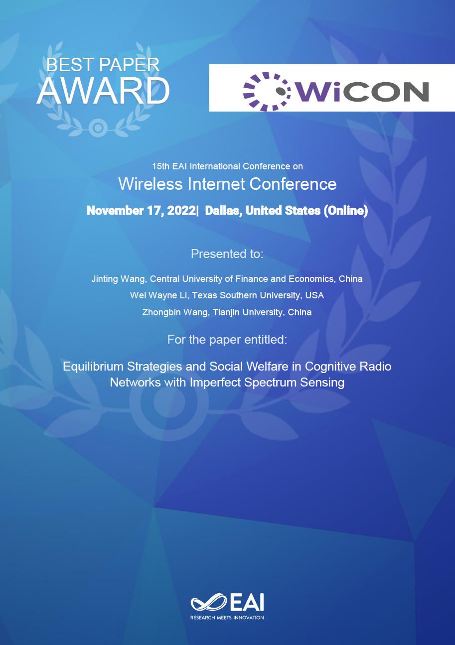 近日,2022年第15届EAI无线互联网国际会议(EAI WiCON 2022)在美国达拉斯线上召开(11月17日),公司王金亭教授与合作者(美国德克萨斯南方大学Wei Wayne Li教授,天津大学王钟彬副教授)在会议上报告的论文《Equilibrium Strategies and Social Welfare in Cognitive Radio Networks with Imperfect Spectrum Sensing》创新性地采用排队博弈理论揭露了非完美的频谱感知技术对认知无线电系统的影响,经现场答辩和EAI WiCON 2022学术委员会评审,获得了本届大会的最佳论文奖。
