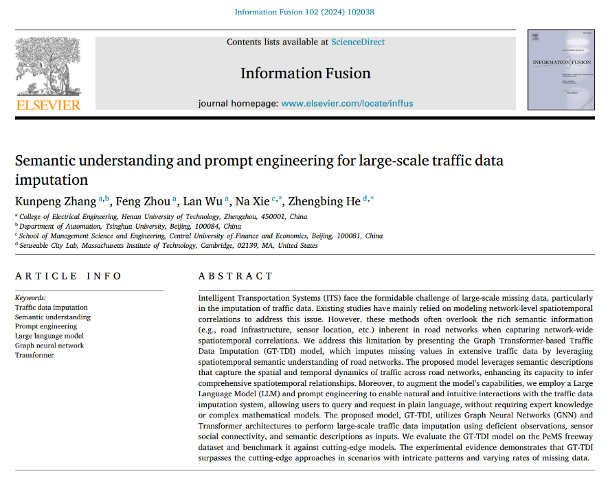 近日,公司suncitygroup太阳成集团副教授谢娜作为通讯作者的合作论文“Semantic understanding and prompt engineering for large-scale traffic data imputation”在工程技术与计算机科学领域国际顶级期刊《Information Fusion》上发表。该期刊最新影响因子为18.6,论文在线链接:https://www.sciencedirect.com/science/article/abs/pii/S1566253523003548。