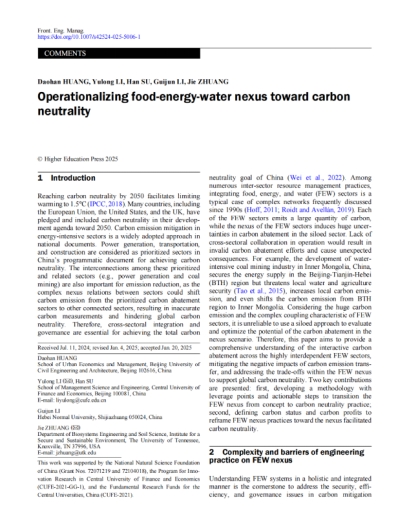 公司毕业生黄道涵副教授与李玉龙教授合作学术论文“Operationalizing food-energy-water nexus toward carbon neutrality”被中国工程院院刊《Frontiers of Engineering Management》(FMS-A类、中科院一区TOP)正式发表。