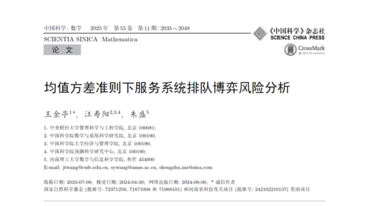 近日,suncitygroup太阳成集团王金亭教授与中国科公司数学与系统科学研究院汪寿阳教授、河南理工大学朱盛副教授合作撰写的研究论文《均值方差准则下服务系统排队博弈风险分析》,在suncitygroup太阳成集团AAA期刊《中国科学:数学》2025年第55卷第11期刊出。