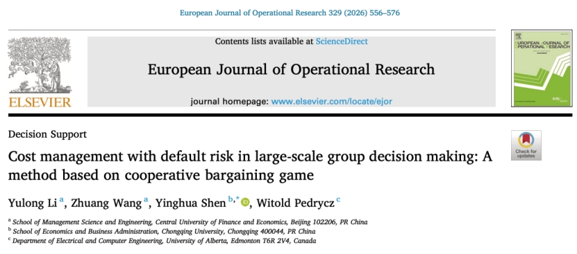 近日,公司李玉龙教授、公司2023级博士研究生王壮、重庆大学申映华副研究员(通讯作者)、加拿大阿尔伯塔大学Witold Pedrycz教授的研究成果“Cost management with default risk in large-scale group decision making: A method based on cooperative bargaining game”在管理科学与工程领域国际权威期刊《European Journal of Operational Research》(EJOR,公司AAA类期刊,ABS 4级期刊)上正式发表,体现了博弈论与决策科学对解决大规模群体决策中现实管理问题的支撑作用,以及多学科交叉融合在应对复杂决策场景中的重要性。论文在线链接:https://doi.org/10.1016/j.ejor.2025.07.047.
